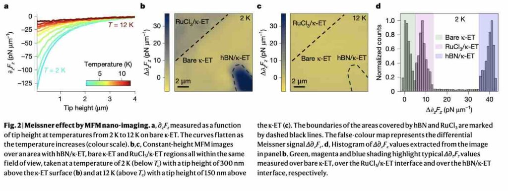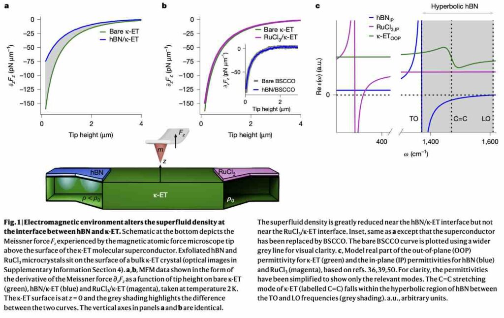 超导材料的迈斯纳效应(完全抗磁性)是其内部存在宏观量子态——超流的直接体现。研究团队将一片仅有数十纳米厚的六方氮化硼(hBN)晶体放置在分子超导体κ-ET的表面上。hBN在特定红外频段具有双曲性——即其不同方向上的介电常数符号相反,从而能够在其表面附近高度局域化并增强电磁场,形成一个天然的、共振调谐的“超构电磁腔”。