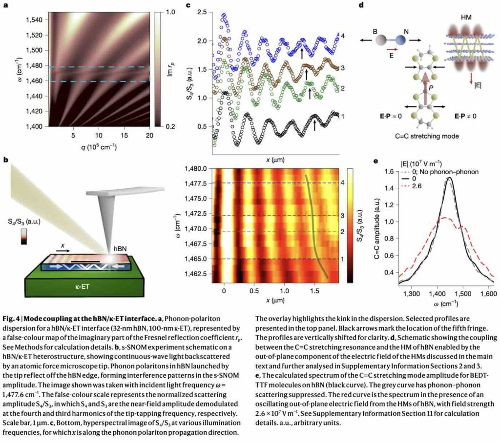 尤为关键的是,hBN的“双曲声子极化激元”模式(HMs)的频率,恰好与κ-ET中碳-碳(C=C)伸缩分子振动的频率重叠,该振动被认为与材料的超导机理有关。通过散射型扫描近场光学显微镜(s-SNOM),研究者在实验上直接观测到hBN的极化激元模式与κ-ET的C=C振动在界面上发生耦合,形成了杂化模式。
