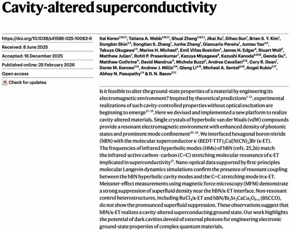 长期以来,对材料量子基态(如超导态)的操控,主要依赖于外力驱动,如光照、磁场或压力,以激发电子或晶格系统的响应。然而,一个更为前沿和精妙的设想是:能否通过被动地设计材料所处的电磁“环境”来改变其内在性质? 发表于《自然》杂志2026年2月刊的封面文章《Cavity-altered superconductivity》为这一设想提供了首个实验证明。该研究由哥伦比亚大学、马克斯·普朗克物质结构与动力学研究所等多家机构的科学家合作完成,他们利用一种特殊的双曲范德华材料作为“暗腔”,在不使用外部光泵浦的情况下,成功实现了对分子超导体κ-ET的超导态的调控,标志着超导材料操控迈入“环境工程”的新阶段。