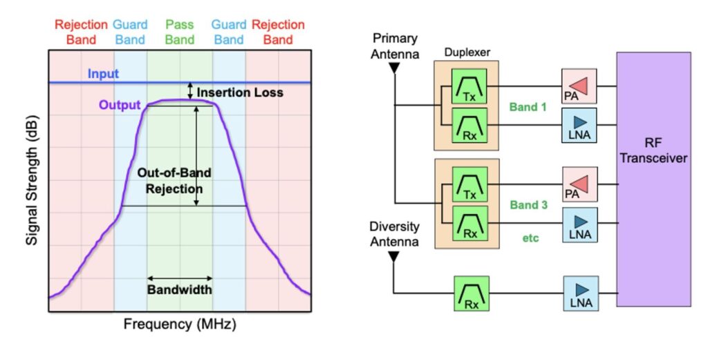 在 LTE 系统中,设备可能需要支持 40 多个频段 (从约 700 MHz 到 3600 MHz)。而一部手机通常实现 6–15 个频段。每个频段的接收 (Rx) 滤波器能让设备检测特定频段的信号,并抑制来自其他频段的干扰;而发射 (Tx) 滤波器则负责减少发射时非目标频率的能量。对于同时有发射和接收的FDD(全双工)LTE设备,如果发射和接收频率靠得很近,就可能产生“自干扰 (self-desense)”。这种情况下,滤波器组合可能需要 50–60 dB 的隔离度。相比之下,TDD (时分双工) 系统因为不同时发射和接收,对滤波器的隔离度要求较低 (约 20–40 dB)。