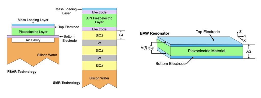 在 BAW 技术里,常见两种实现方式:FBAR (自由悬挂膜) 和 SMR (Solidly Mounted Resonator, 实固式谐振器)。FBAR使用气腔 (Air Cavity) 来隔离底电极与载 Substrate,使得谐振膜仅在边缘与基底连接。SMR则使用 Bragg 反射层 (由多个低 / 高声阻抗薄膜交替构成) 来反射声波,从而将声波能量困住。