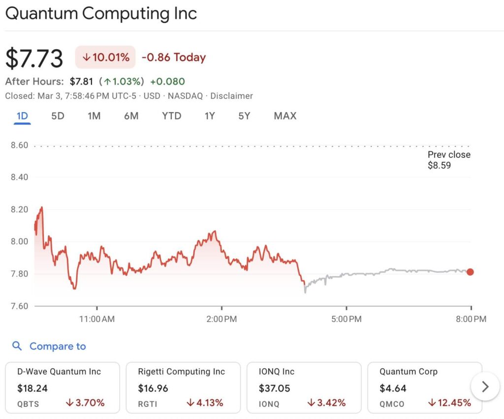 2026年3月2日,Quantum Computing (QUBT) 最新公布的第四季度财报显示,其盈亏情况符合市场预期,但营收未达标。2026年,量子计算板块表现不佳,其中 QUBT 股价下跌了 16%。我们可以看到市场和资本对量子计算的态度开始发生变化。