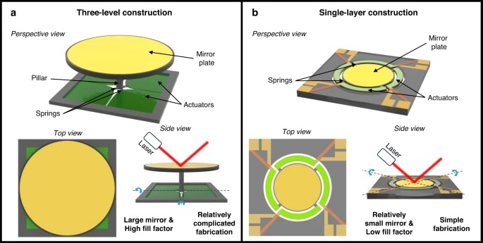 依据近年来的研究成果,韩国延世大学(Yonsei University)机械工程系的Yohan Jung, Dongseok Lee & Jongbaeg Kim教授对 AlN 与 AlScN 在材料特性、制造工艺与微镜性能方面的差异进行了系统梳理,重点讨论两类材料在高频、小型化 MEMS 微镜中的实际表现及工程挑战。发表在自然杂志的文章《Recent progress in aluminum nitride for piezoelectric MEMS mirror applications: enhancements with scandium doping》为未来高性能光扫描系统的材料选择与工艺优化提供了参考。